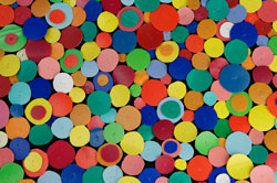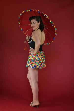 Colorful number 2 HDPE post-consumer plastic detergent bottles were cut into circles, punched with two holes and hand-sewn onto a 1950s vintage bathing suit, an umbrella and shoes. It took 150 hours to create the bathing suit, umbrella and shoes.