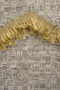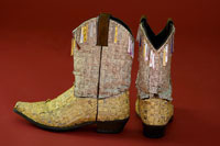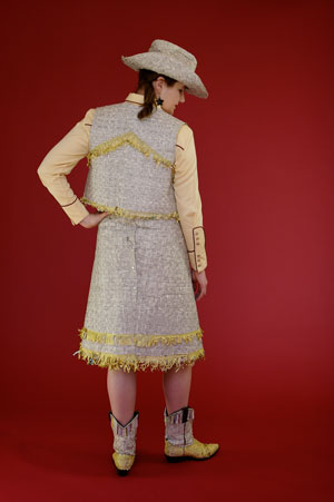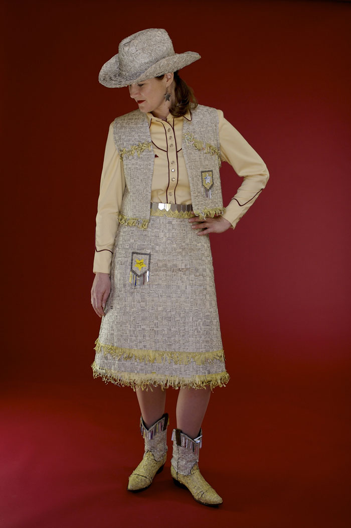 This outfit is made of old phone book pages that were woven together and made into a skirt and vest. Woven directories also cover the vintage "pee-wee" cowgirl boots and hat. CDs containing phone directories are used to accent the outfit. The hat, vest, skirt and boots took 125 hours to create.