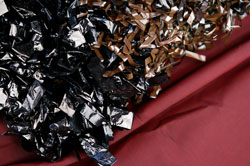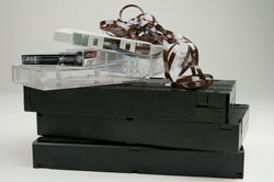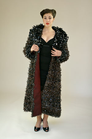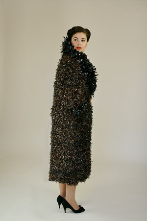 into the fabric of a thrift-store coat; discarded video tape is used to accent